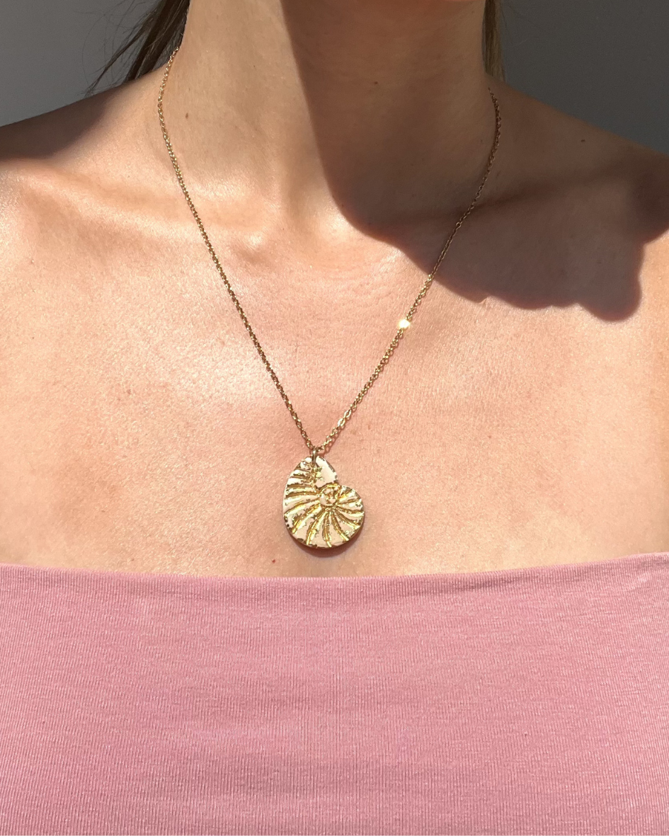 Collar inspirado en la forma natural de las caracolas de mar, con su espiral que evoca conexión con el mar. Una pieza que transmite tranquilidad.