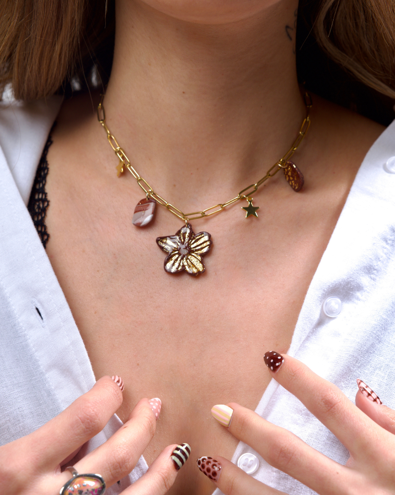 Collar inspirado en la delicadeza de las flores, con un diseño sencillo pensado para el día a día, fácil de combinar y con ese detalle especial que marca la diferencia.