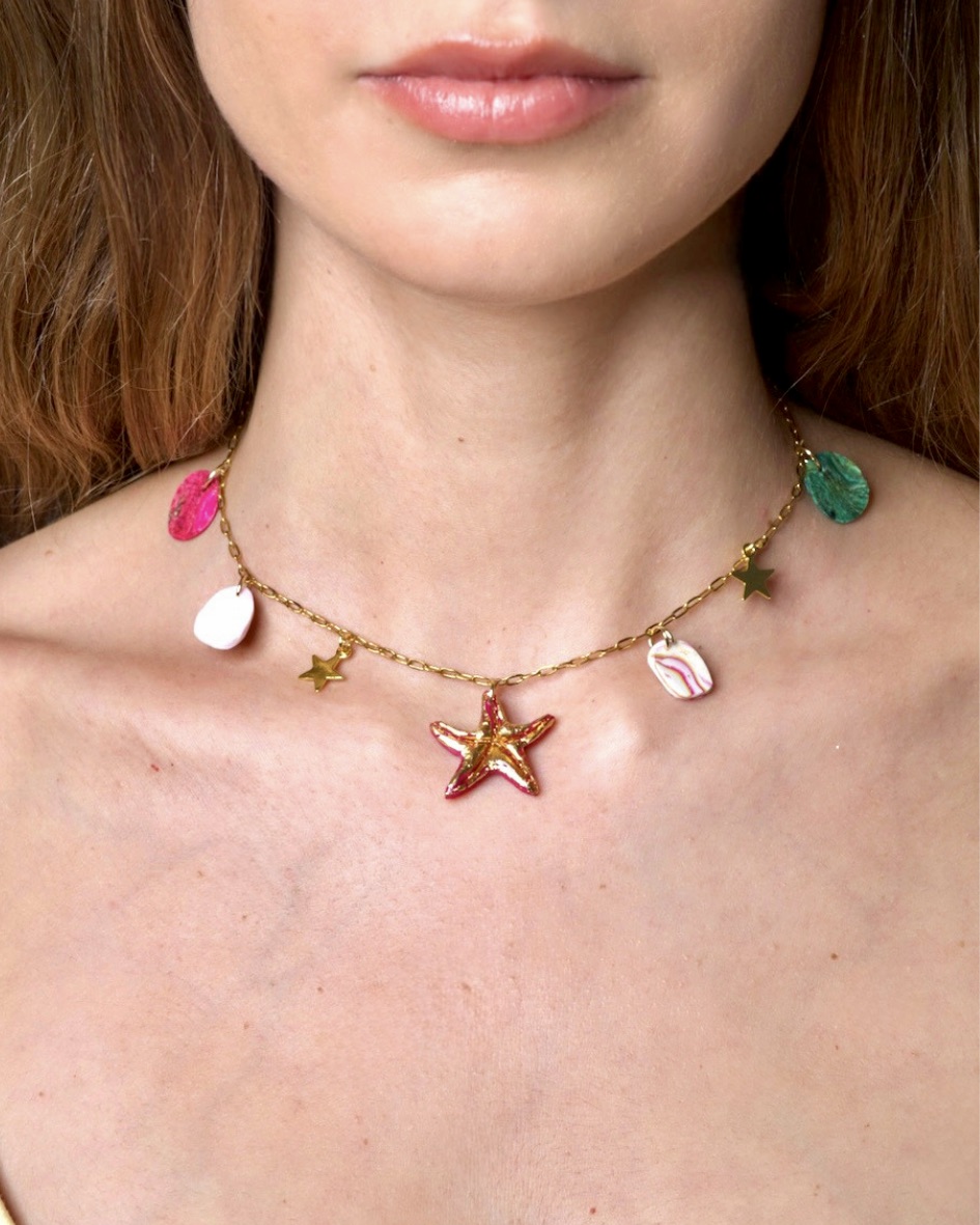 Collar inspirado en los reflejos del sol sobre el mar, con un brillo cálido, representando ese momento dorado del día en el que todo se ve más bonito.